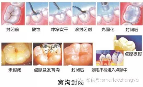 做窝沟封闭时,牙面要进行彻底清洗,除去滞留的食物残渣及细菌。然后进行牙齿酸蚀,使其窝沟表面呈微小细孔,利于窝沟封闭剂渗入其中,以达到封闭作用,最后彻底吹干,除去窝沟内滞留的水分,以免影响树脂的固化和与牙表面的粘接强度。涂上窝沟封闭剂,最后用医用灯在口腔内照10-20秒。