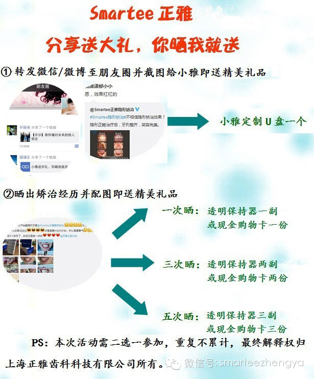 PS:牙套君们不仅可以在朋友圈中晒,在新浪微博等第三方平台晒也可得到小雅的精美礼品!(记得晒单含有“Smartee正雅”字样并截图给小雅哦)