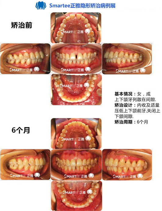 病例为因牙周炎导致上下颌前牙区散在间隙,在控制牙周炎的基础上进行隐形矫治。通过内收上下颌前牙关闭间隙6个月达到的效果。矫治结束后,前牙区的“黑三角”可以通过追加少量邻面去釉,继续内收改善,也可以直接结束。