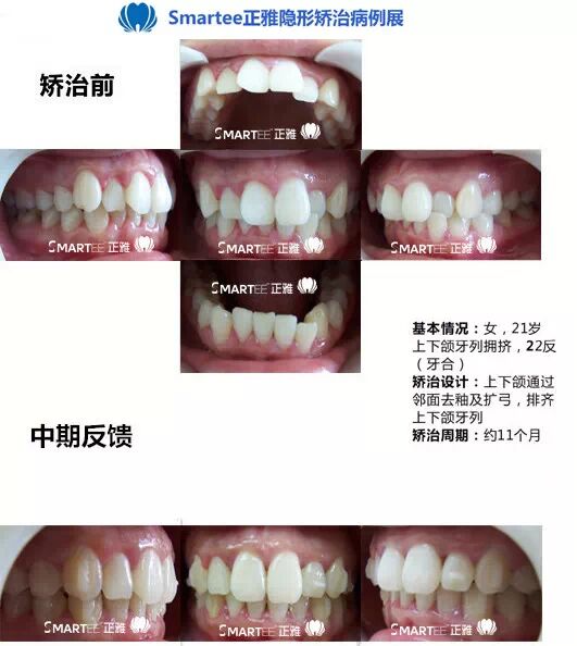 病例为上下颌牙列拥挤,22反(牙合)。矫治11个月反馈,牙列基本排齐,22反(牙合)解除。
