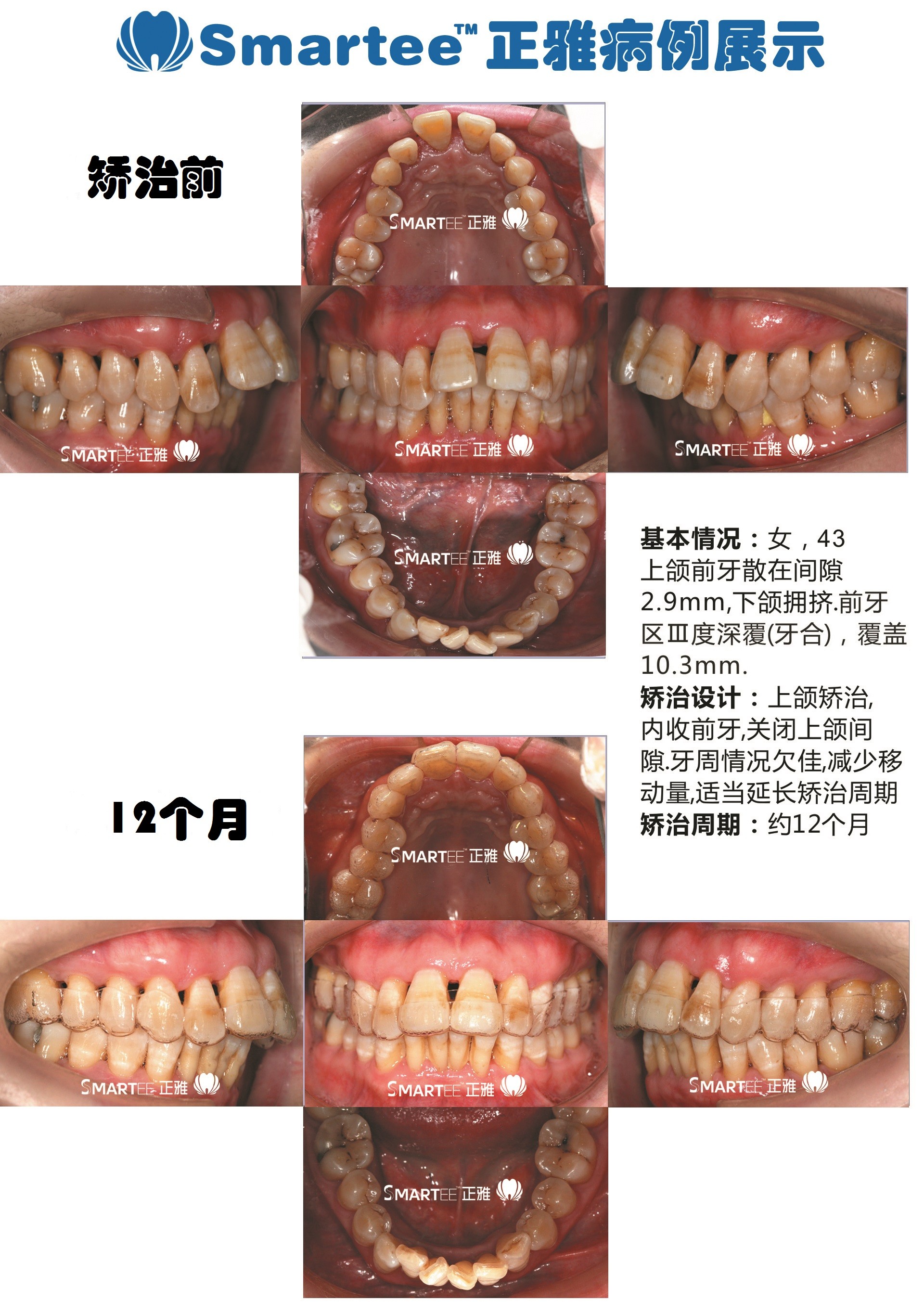 病例为牙周炎患者导致牙齿出现间隙,对于此类病例,隐形矫治有着较大优势。优势点在于:第一、隐形矫治本身为轻力矫治,基本不会对牙齿造成损伤;第二、隐形矫治可以控制每步牙齿移动量,对于此类患者,可以适当减少每步移动量;第三:隐形矫治可自由摘戴,易于在矫治过程中,清洁牙齿。对于该病例,患者仅进行上颌矫治,通过内收关闭上颌间隙,12个月后,上颌间隙关闭完全。矫治过程中,医生定期调(牙合),减少矫治过程中产生的早接触,同时在矫治设计中,每步移动量减少,在矫治器的生产中,仅包裹牙冠大约1/2,减少因为摘戴对牙齿影响。