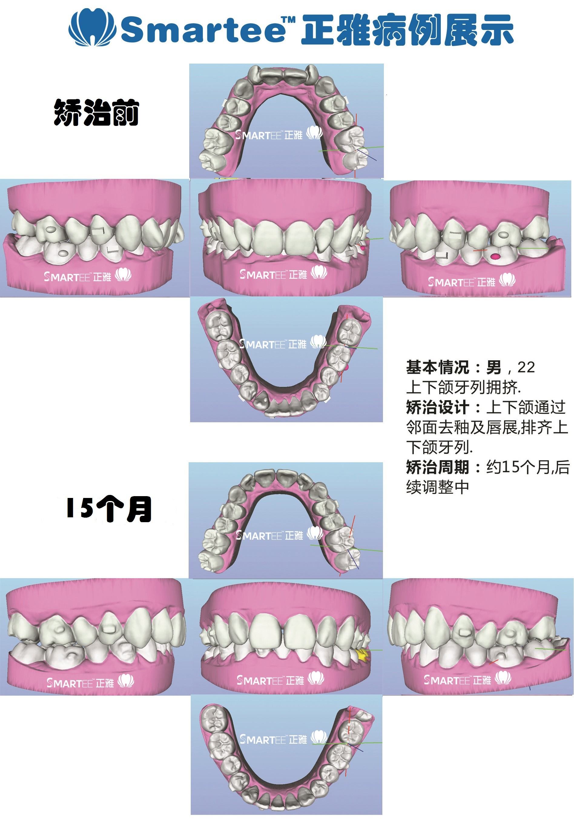 病例为上下颌牙列间隙,22过小牙。矫治设计为内收关闭上下颌间隙,上颌剩余少量间隙调整至22近远中,以备后期修复。