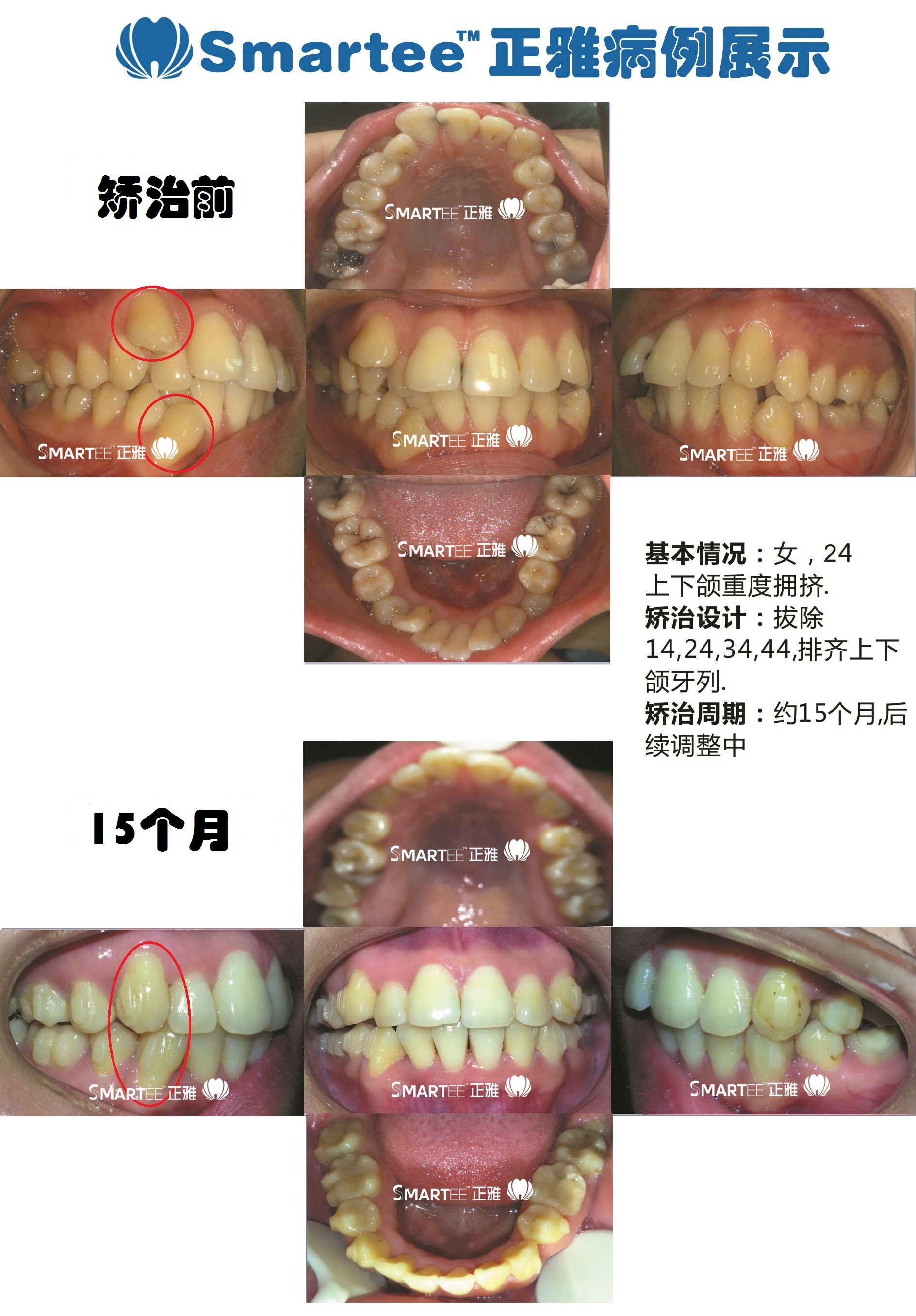 病例为上下颌重度拥挤,拔除4个第一前磨牙,目前矫治大约15个月。可以看到13已经从弓外牙顺利的纳入牙弓,43近中倾斜特别严重的牙齿也已经直立起来(红圈所示)。