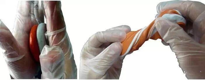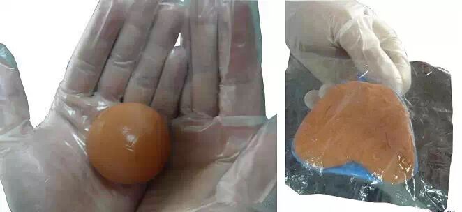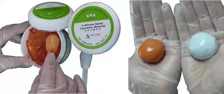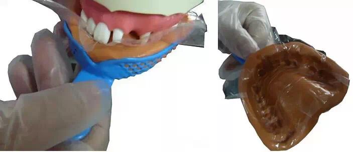 二、按1:1比例取适量的硅胶印模材重体,充分混合后放入托盘,上面覆盖塑料薄膜。