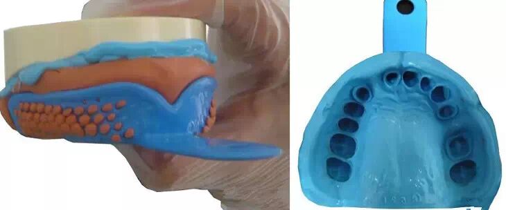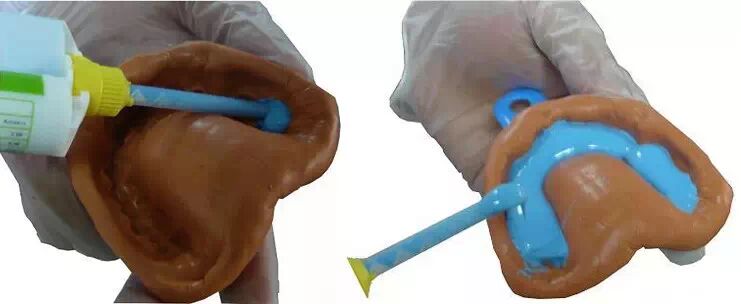 七、将托盘放入口内,以轻微压力和颤动方式使印模托盘就位,在印模材未完全固化前,手不要离开托盘,对托盘略使力量,以免印模变形。