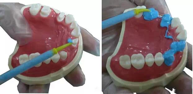 五、将硅胶印模材轻体用枪(带口内注射头)注入已经排龈的基牙龈下和周围。
