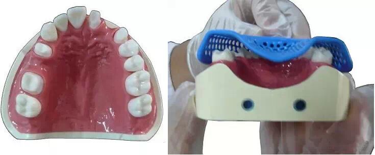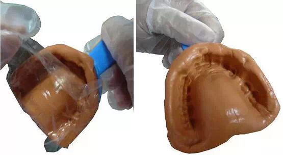 四、检查印模是否有缺陷,扯掉塑料膜,这时硅胶印模形成与牙列空隙厚度均匀的个别托盘。